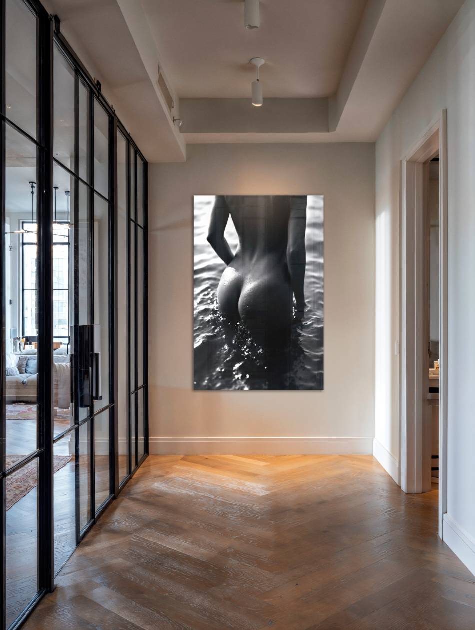 Black and white nude artwork of a beautiful woman. Stylish erotic wall art featuring a sexy lady in black and white. This luxurious, sensual wall art is available as sound-absorbing wall art, Dibond artwork, or as a chic plexiglass artwork.