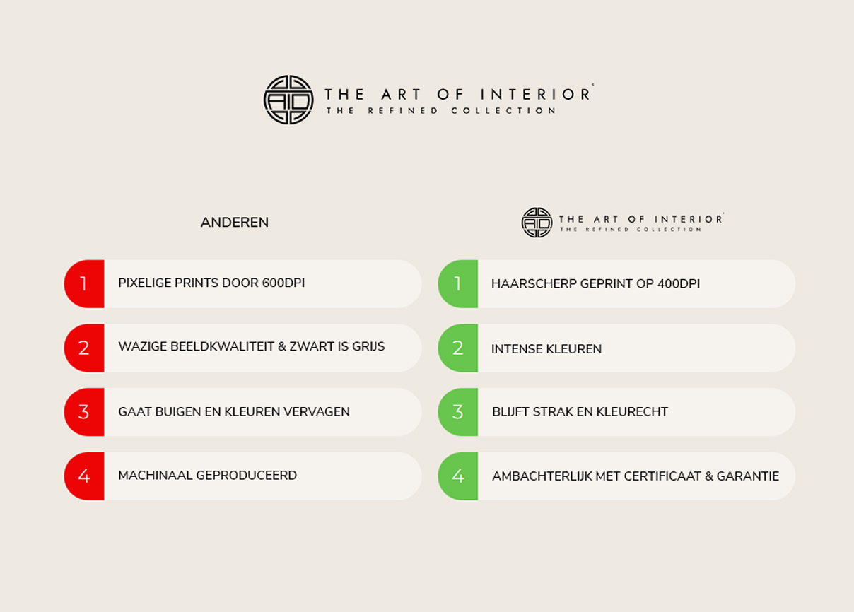 The Art of Interior is internationaal vertegenwoordigd door diverse interieurzaken, architecten en interieurstylisten in het hogere segment. Ook via de website kunt u gemakkelijk en snel uw fotokunst op plexiglas bestellen. Onze collectie is zeer divers; van een biddende monnik in India tot het metropolische Madrid. Daarnaast komen wij regelmatig met nieuwe collecties van internationale topfotografen. Het artwork bieden wij aan op diverse formaten én mogelijkheden. Bijvoorbeeld een wit of zwart frame om het artwork. Of met de handtekening van de fotograaf en de naam van het werk voor een elegante uitstraling. Heeft u een andere suggestie of wenst u een afwijkend formaat? Laat het ons dan weten via ons contactformulier of neem contact op met onze klantenservice via het nummer 085 401 0907.