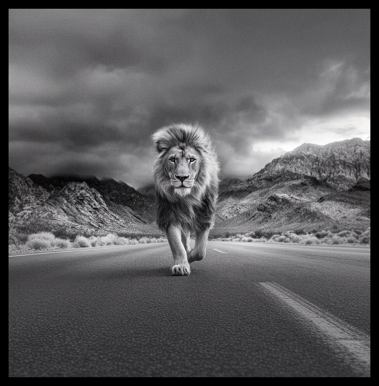 Décoration murale en noir et blanc représentant un lion puissant