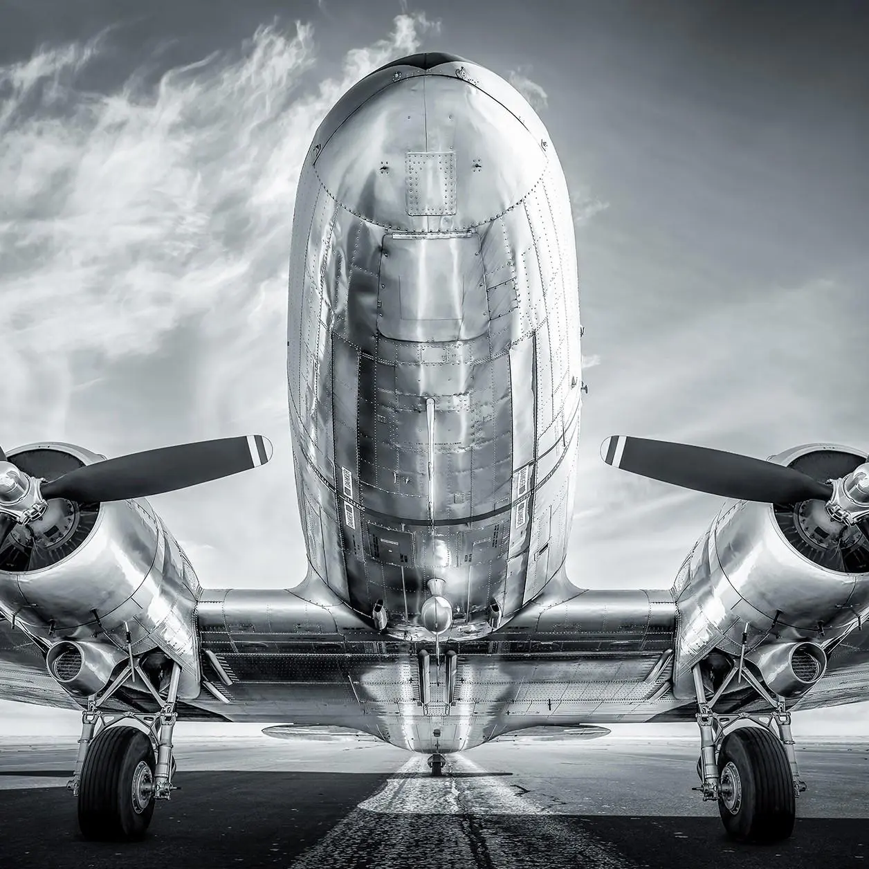 Zwart wit fotokunst van een vliegtuig. Sinds de gebroeders Wright met de Wright Flyer in 1903 een eerste gecontroleerde vlucht met een gemotoriseerd vliegtuig maakten, heeft de luchtvaart een hoge vlucht genomen. Naast piloten raakten vele kunstenaars gecharmeerd van deze grote, opstijgende machines. Het plexiglas schilderij The aviation collection is kunstfotografie in de puurste vorm. Het perspectief vanaf de onderzijde laat het vertrekkende of aankomende vliegtuig in al zijn grootsheid zien. Aan de andere kant toont de lange start- en landingsbaan en het uitgestrekte landschap de nietigheid van de vliegmachine. De zwart wit fotografie kunst op plexiglas en de metallic glans van het vliegtuig zorgen voor een indrukwekkend beeld in jouw interieur. Verkrijgbaar op onder andere plexiglas, Dibond en akoestisch vilt.